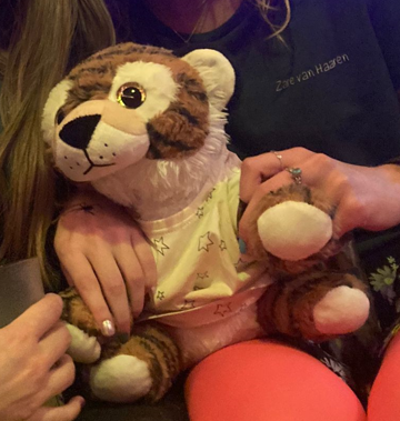 Eerst gingen we eten bij Romy. πŸ˜‹ Die had lekker pasta klaargemaakt samen met Anouk. Dat was lekker smullen! πŸ˜‹πŸ₯£ We moesten ook een naam verzinnen voor onze knuffeltijger. 🐯 Er kwamen veel namen langs: Timmie en Tommie en Dora en Tijmen en nog veeel meer. Maar de allerleukste vonden wij Taco! Kijk dit is Taco, lief he!!!!!!! πŸ§‘πŸ’œ